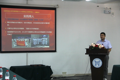 交流汇报结束后,党委书记王斌对本次学生工作研讨会作总结讲话。他深入解读了社会主义核心价值观提出的背景及意义,强调社会主义核心价值观教育是下一阶段学生工作的重要指导思想,并就如何结合社会主义核心价值观24字方针有效开展当前工作进行了详细阐述。他要求,要加强学生工作队伍建设,扎实推进基础工作,以宣传工作为切入点,着力打造以孝心社、MOOC学社为依托的精品社团活动,努力推动我院思想政治工作再上一个新台阶。