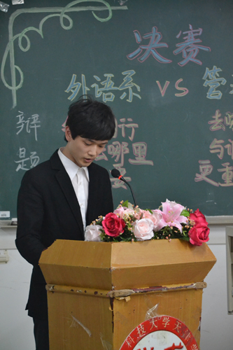 在激昂的国歌声中活动正式开始。首先播放了求是学会第六届“理论星光活动月”闭幕式回顾视频,感动的片段,友情的瞬间,使在场观众感慨万千。随后,辩论会决赛正式开始,由外语系代表队对阵管理系代表队。开始辩论前,双方分别结合PPT进行团队风采展示;首轮环节,正方引经据典,慷慨陈词,反方巧思敏捷,舌灿莲花;自由辩论环节,面对“与谁同行和去哪里哪个更重要”的艰涩辩题,外语系出口成章,运用马克思主义主观能动性的观点,坚持认为与谁同行比去哪里更重要,而管理系也是妙语连珠,结合人与事物的联系,更引用“路漫漫其修远兮,吾将上下而求索”来印证遵循目标是过程的基础与前提。整场比赛精彩纷呈,现场气氛活跃,评委和观众听得津津有味,不时爆发出笑声和热烈的掌声。比赛结束,李徽老师对本场比赛进行了点评,将团队精神与明确目标结合到日常学习生活中,精辟到位,入木三分,现场掌声如潮。随后,求是学会第八届理事会会长郝明鉴作求是学会第六届“理论星光活动月”活动汇报,回顾过去,着眼现今,言辞诚恳,汇报切实,让人一览“理论星光活动月”的收获。学院团委副书记何红升作总结发言,提出“感谢、成长、希望”三个关键词,侃侃而谈,鞭辟入里,教人受益匪浅。