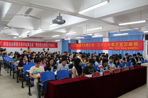 本届辩论赛为期四周,本着活跃校园气氛,开阔学生视野,丰富同学们的课余生活的宗旨,经过八系淘汰赛、四强半决赛等环节,最终,经济系代表队、管理系代表队杀入决赛。冠亚军争夺赛中,两队围绕着“代沟产生的主要责任在于子女还是父母”展开了激烈的辩论。参赛双方你来我往,唇枪舌剑却又不失风度,你攻我防,转换有序,赛场气氛慢慢升温。在自由辩论阶段,赛场气氛达到高潮,双方引用诸多实例辅以论证,观点新颖,思维灵活,妙语连珠,博得了满堂喝彩,充分展示了我院学子扎实的理论功底和宽广的知识面。整场比赛精彩纷呈,现场气氛活跃,评委和观众听得津津有味,不时爆发出笑声和热烈的掌声。比赛结束,田勇老师对本场比赛进行了详实的点评,在给予参赛选手肯定与鼓励的同时,也指出了双方存在的不足之处。随后,求是学会第七届理事会会长姚楚航作求是学会第五届“理论星光活动月”总结汇报,系统的梳理了求是学会第五届“理论星光活动月”的工作,并对求是学会未来的发展提出了希望。