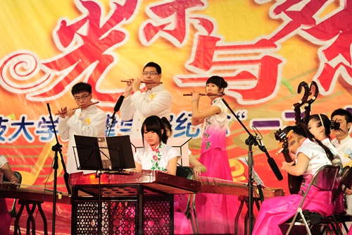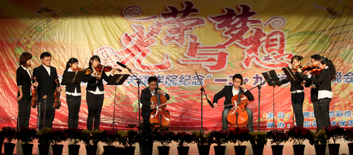 晚会在中国电影交响乐团王永林老师指挥的管弦合奏《四渡赤水出奇兵》、《爱我中华》与合唱团精彩演唱中拉开了帷幕。一个个精彩纷呈的节目随之上演——由合唱团李晔深情演唱了《I Believe》;舞蹈团也带来了青春洋溢,活力四射的群舞《踏春歌》;礼仪队充满感情的朗诵《祖国啊,祖国》让听者更是油然而生身为中国人的自豪之感;民乐团演奏的《风居住的街道》,二胡、电子琴、舞蹈的搭配对话,令人耳目一新;合唱团和舞蹈团联袂演出的《共和国之恋》深刻剖析表现出了华夏儿女对祖国的深厚情感和无比忠诚;民族联舞《中华舞彩》让人更是目不暇接,不仅向现场观众展示出各个民族的风采,更将晚会推向了高潮;民乐团也演奏了一曲轻松欢快的《塔塔尔族舞曲》;女生独唱一曲《至少还有你》,在这个寒冬给人心里一席温暖和感动;小合唱《stand by me》让人体会到身边有朋友支持的力量和坚持下去的信念;弦乐合奏的经典之作《卡农》给人以安静的聆听与舒适之感;歌曲串烧《习惯了生活》、《不懂》、《遗失的美好》、《你把我灌醉》、《人间》、《绿光》,这一首首风格各异,但都给人似曾相识之感的歌曲在不同歌手的演唱中也带给人不同的回忆与感触;舞蹈团带来的《映山红》,完美地诠释了那个年代中国人民情纯朴但浓烈,同时热情而豪迈的爱国之情。最后,演出在《难忘今宵》中画上完美的句号。纵观整场演出,气氛欢快、基调热烈,艺术团全体成员通过演唱、舞蹈、管乐合奏、民乐合奏等艺术形式,为全场观众奉献了一场饱含激情、别具特色的演出。