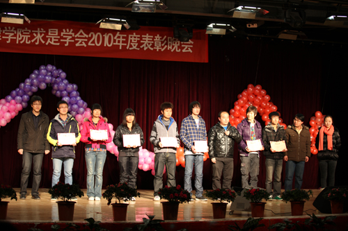 12月14日晚7点,问鼎国际 求是学会2010年度表彰晚会于学生活动中心二层隆重举行。团委组织部部长黄志强,团委科技部部长、青年志愿者指导中心主任田勇,艺术团指导老师林碧芸、经济系分团委书记曹晓勇出席此次晚会。