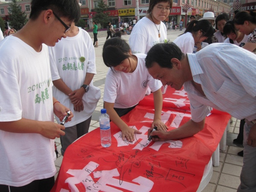 2010年7月21日我院社团联合会“减C”实践团队踏上了绿色低碳之行,调研学习绿色低碳相关知识,宣传绿色低碳这一环保新理念。实践团先后参观了同煤集团中央机厂、朔州市林业局、防护林工程等等,与绿色低碳专业人士座谈、交流,了解了现在国有企业对于低碳减排的认识及其针对一些问题所采取的措施,并对附近不同年龄、层次居住居民进行了问卷调查,以及签名宣传活动,使实践团成员加深了对“绿色低碳”的认识,对我国现在针对“绿色低碳”采取的措施有了更深的了解。