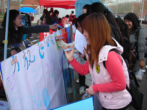 开幕式内容包括心理涂鸦、心理错觉图展览和派发心理书签。现场的“心情涂鸦”专区吸引了不少感兴趣的同学,他们用彩笔在白板上画出自己的心情,与周围同学分享;心理错觉图展览让大家认识了有趣心理现象,吸引大家关注自身心理;精美的心理书签既给大家提供了方便,又宣传了心理健康的理念,深受大家的喜欢。虽然天公不作美,下起了蒙蒙小雨,但是没有浇灭大家的热情,他们把那份快乐与健康传递给了周围的人。