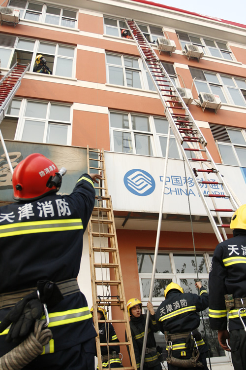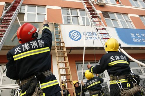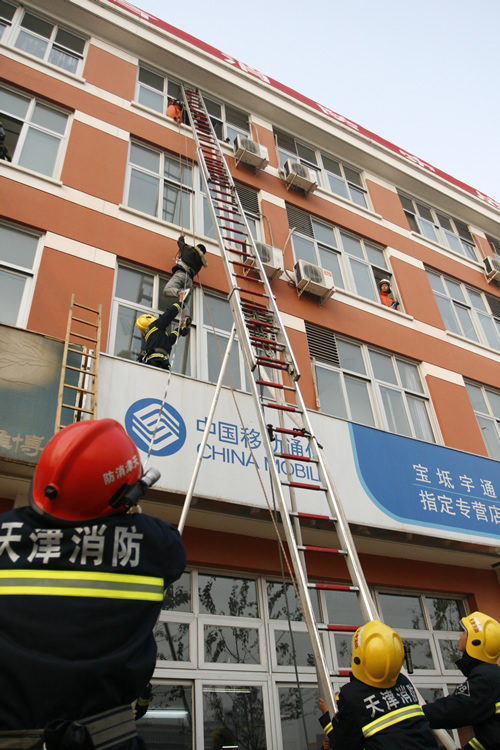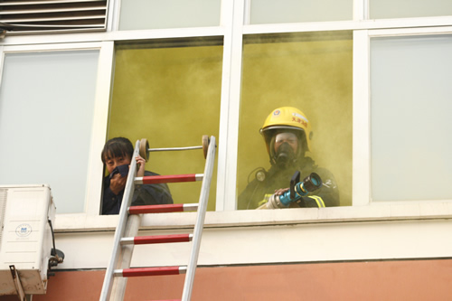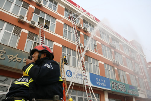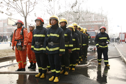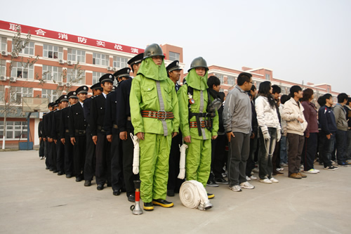 为了搞好这次联合演习,我院制订了严谨、详细的演习方案,成立了领导小组,由院长郭景文担任组长,党委书记王斌、副院长曹连东、财务总监肖祖刚担任副组长,现场总指挥由天津市公安消防局宝坻支队办公室主任苑增江担任,学生处处长盛佳伟、保卫处处长何国钧担任副指挥。下午3点30分,演习正式开始。学院保卫处处突小分队战斗员迅速穿上消防战斗服,佩戴空气呼吸器、防毒面具及无耻锯、扩张器、剪断器等先进的破拆工具进入火场进行第一时间的救援与疏散。其他保安员迅速拉开警戒线,维护现场秩序,配合疏散。参加演习的学生在消防员的引导下用湿毛巾捂住口、鼻,从学生公寓有序撤离。