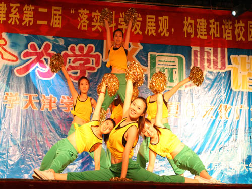 晚7:00,法学083班的集体舞蹈《床前明月光》为本场比赛拉开序幕,在主持人宣告评分细则之后比赛正式开始。法学087班第一个出场,一首《感恩的心》博得了场下观众热烈的掌声。随后,参赛班级以条幅、礼炮、舞蹈、朗诵、灯光拼图、蜡烛、荧光棒等新颖别致的形式表现了“落实科学发展观,构建和谐校园”的主题思想,14个班折射出的七彩光芒,给大家带来了一场精彩的音乐盛宴。法学083班的一首《明天会更好》成为本场比赛的最大亮点,整齐协调的演唱,优雅动人的舞蹈相互配合得当,将整场比赛推向了高潮。比赛环节结束后,艺术教育中心老师张鹏点评,对于参赛班级的表现给与肯定,指出各班级的优点与不足。持续了近两个多小时的比赛在获得本部健美操比赛二等奖的参赛队表演中落下帷幕。