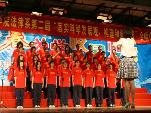 5月14日,“落实科学发展观,构建和谐校园”法律系第二届合唱比赛”在我院活动中心二楼隆重举行。法律系党总支书记代鸿滨、艺术教育中心主任李坤、团委副书记李静雯、各系分团委书记及老师担任比赛评委。此次比赛由法律系分团委主办。