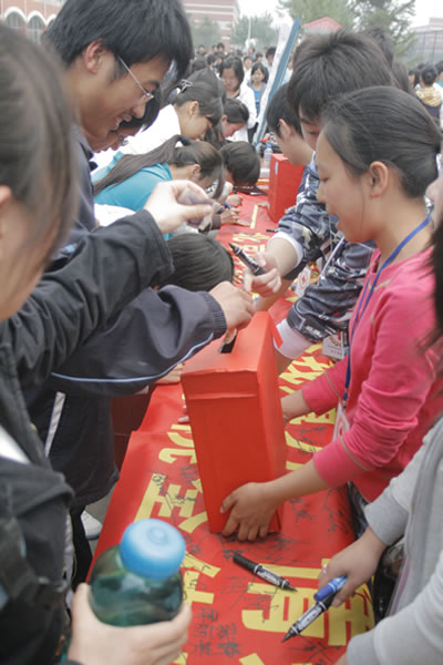 院长张文明教授将捐款投入募捐箱内,并在写有“众志成城,抗震救灾,尽我薄力,情系灾民”的条幅上签下自己的名字,学院领导及中层领导干部、广大师生们纷纷捐款并在条幅上签字。表达关注灾情的心意及祝福灾区人民的爱心。
