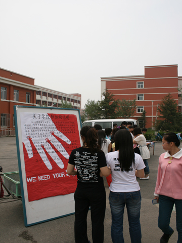5月16日,院红十字会在捐款活动之后相继组织的为灾区献血的报名活动在学生三食堂门前举行。报名现场非常热烈,红十字协会贴出了有关献血知识的宣传栏,发放献血宣传单,并发起了报名倡议书,来往的同学踊跃填写了报名表。