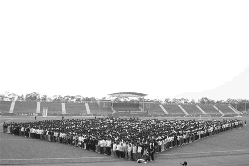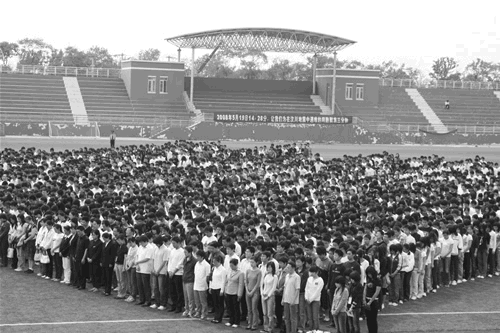 14时,全院教职员工及无课班级准时集结在体育场。14时20分,校园广播鸣响,全体人员表情肃穆、神态庄重。14时28分整,警报鸣响,全院师生默哀三分钟。