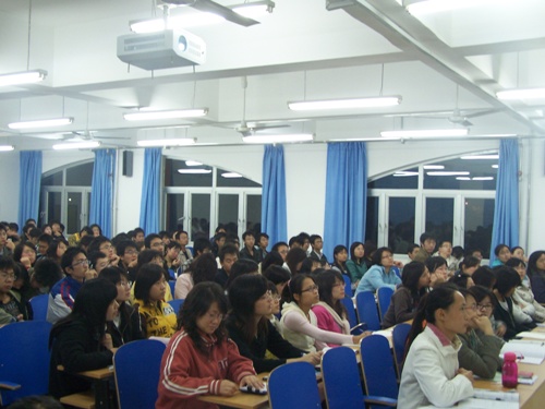 首场讲座由世华财迅公司金融讲师陈杰先生向参赛同学介绍了参赛方式及比赛规则。并讲述外汇股票、期货及股指期货等内容,同时从全球机构的角度看市场,结合国际经济一体化合理分析了当前股票形势。