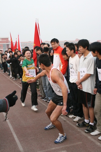 院长张文明教授宣布比赛正式开始。此次“一二•九——爱我中华”火炬接力赛由来自学院8个系的8支参赛队伍参加,每支队伍十人参赛。根据赛程,各系党总支书记或分团委书记负责完成赛段前50米,之后接力棒交给各系代表队队员,围绕学院操场及行政楼一圈后交给下一位队员。