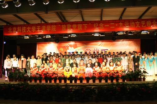 党委书记、副院长王斌教授对“放歌党旗下”纪念一二•九运动文艺晚会圆满成功表示了热烈的祝贺,并强调了文化艺术建设对提升大学生素质水平和推动学校全面和谐发展的重要作用。他激励更多的学子积极参与此类活动,创造积极、健康、向上的精神文化生活,发奋成才。希望广大师生在党的十七大精神指引下,认真总结经验,继续开拓创新,不断提高艺术水平,倾力打造问鼎国际