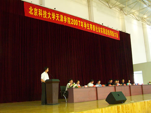 2007年学生寒假社会实践总结表彰大会在体育馆隆重举行。我院党委书记、常务副院长郭景文教授、副院长曹连东、党委副书记、副院长王斌、财务总监尹家林、综合办公室主任李帅、教育技术中心主任许学东、学生事务部副主任、团委书记叶振楠、各专业辅导员及06级全体学生参加了表彰大会。会议由学生事务部副主任、团委书记叶振楠主持。