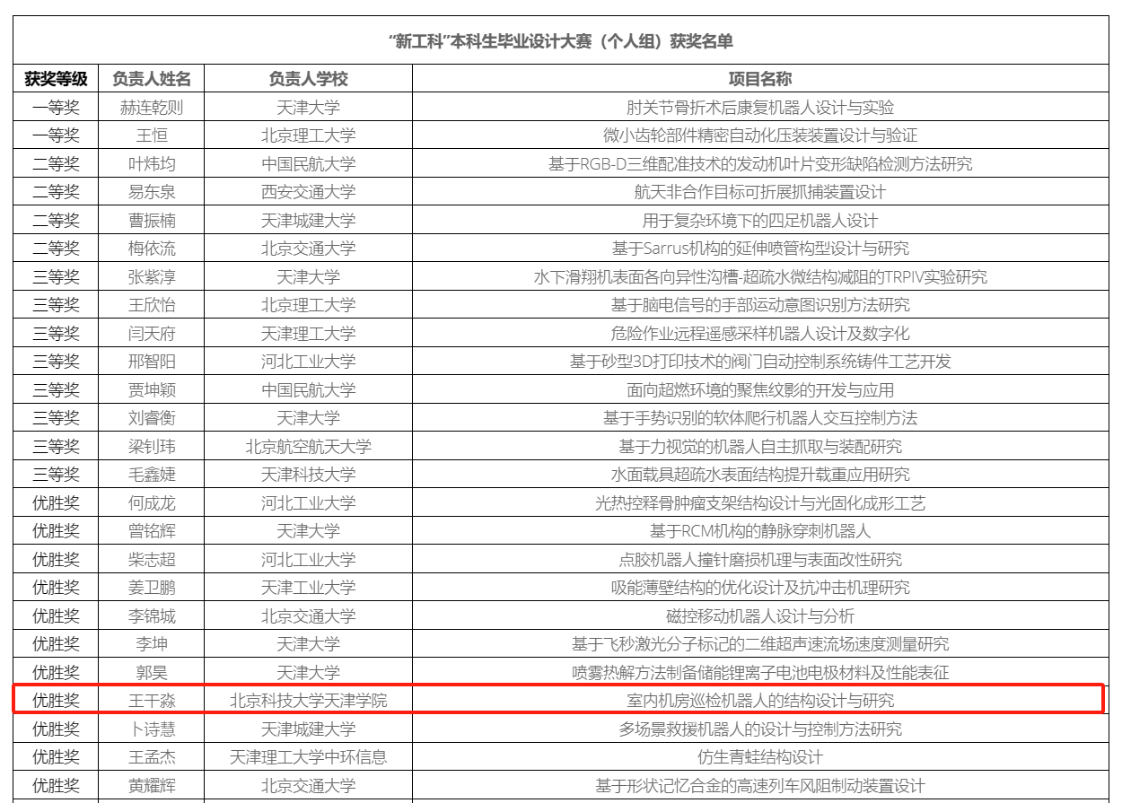 近日,由天津市教委主办的第四届“新工科”本科生毕业设计大赛(暨第十八届“广数杯”本科生毕业设计大赛)全国总决赛圆满落幕。我院智能制造学院机械工程专业2024届毕业生王干淼的毕业设计《室内机房巡检机器人的结构设计与研究》(指导教师:班岚副教授)荣获优胜奖,这是我院学生在此项赛事中首次获奖。