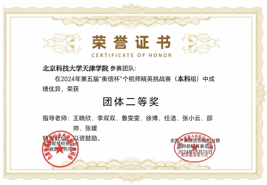 近日,管理学院247名同学在王晓欣等8位老师的指导下,参加了由“全国智慧税务行业产教融合共同体”主办的第五届“衡信杯”全国个税精英挑战赛。此次比赛吸引了来自全国207所本科院校近一万四千余名学生参赛,我院学子经过14天的精彩比拼和激烈角逐,最终以优异的成绩斩获本科组“团体二等奖”。