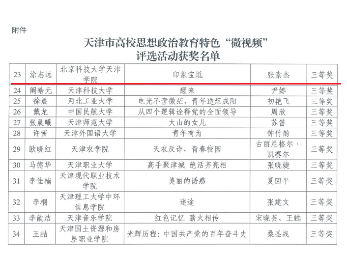 近日,市教育两委公布了2023年天津市高校思想政治教育特色“微视频”评选结果,我院无人机系张素杰团队报送的《印象宝坻》作品荣获三等奖。