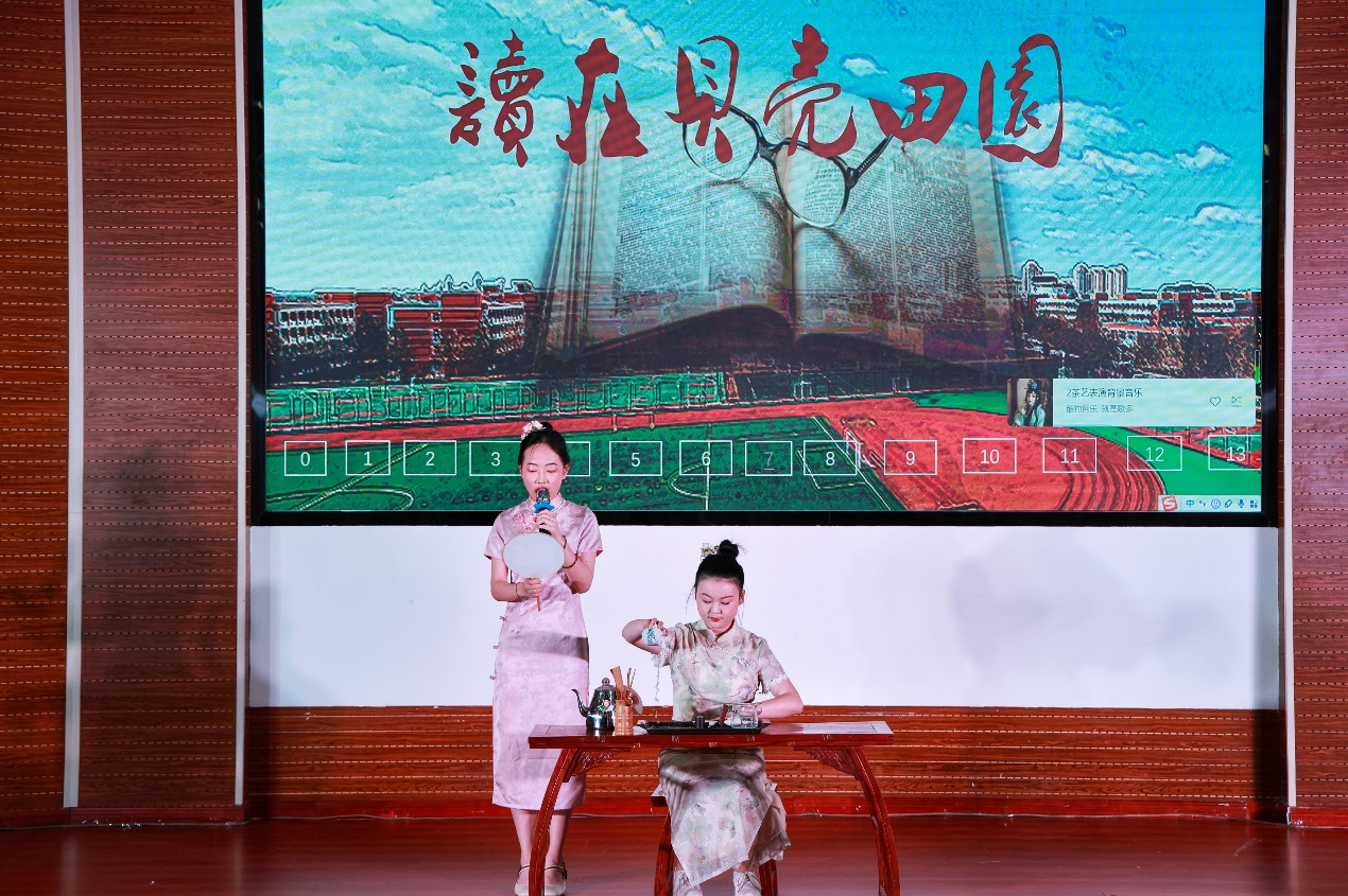 读书文化节晚会在图书馆馆员郑妍和邢智轩带来歌曲《读书之歌》中拉开帷幕,歌声以温馨、励志、正能量的氛围让现场听众仿佛陷入书的海洋,饱览它的妩媚与壮丽、感受岁月无法侵蚀的力量。余音未绝,学生艺术团茶筵社献上茶艺表演《茗红飘香》,通过对红茶冲泡技艺的形象演示,生活化地给观众展示泡饮过程,使观众在优雅环境氛围中得到美的享受和情操的熏陶;师生同台太极书法《文墨武韵》上演,陈学思同学在推柔虚实、连绵畅顺、行云流水的招式中与图书馆馆员李朋洋、施念来同学挥洒自如的落笔有“异曲同工”之妙,共同彰显出中国传统文化之瑰丽;配音表演《这盛世如你所愿》极富感染力,让我们时刻铭记先烈们的牺牲、珍惜当下幸福生活;歌曲《阅读有光》点燃我们内心的火焰且增强无惧风雨,勇往直前的勇气;《琵琶行》用音乐来表达意境,将听觉抽象为一种视觉的形象,展现了人类用文字描写声音的极致,极具美感。汉服舞蹈《礼仪之邦》,歌曲《少年中国说》也迎来阵阵掌声。