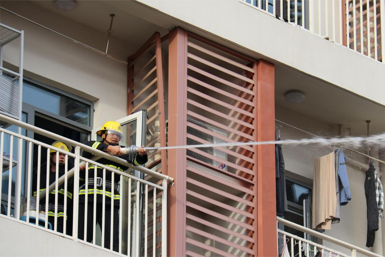 本次演练活动模拟当高层公寓内因违规使用明火引发火情的突发状况,考验同学们的应急自救互救能力和学院应急处置水平。当消防应急广播响起后,参加演练的同学们在学生安全志愿者的引导下,用湿毛巾掩住口鼻,迅速、有序从楼内步梯撤离。同时学院保卫处应急处突小分队在接警后,迅速出动,搜救被困同学,扑救初起火情。参演同学们从容不迫、秩序井然;处突队伍快速反应,果断处置。