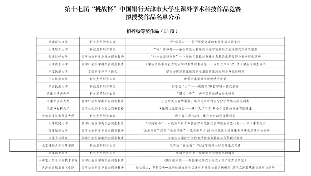 近日,由团市委、市教育两委、市科技局、市科协、天津社科院、市社科联、市学联主办的第十七届“挑战杯”中国银行天津市大学生课外学术科技作品竞赛圆满收官。本届“挑战杯”竞赛我校共十一个作品参赛,最终共有1项获得市级特等奖,2项获得市级二等奖,6项获得市级三等奖,获得历史最好成绩!