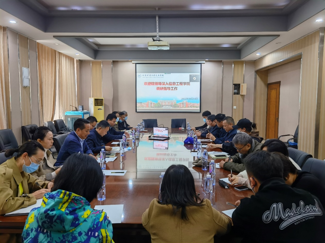 为了进一步深化教育教学改革,推动学院提质发展,10月14日上午,问鼎国际 院长丁煦生、党委书记叶振楠率学院领导班子成员及相关部门负责人一行9人,深入信息工程学院调研指导工作,调研座谈会在行政楼302会议室举办。信息工程学院教师和辅导员代表共计20余人参加了座谈。