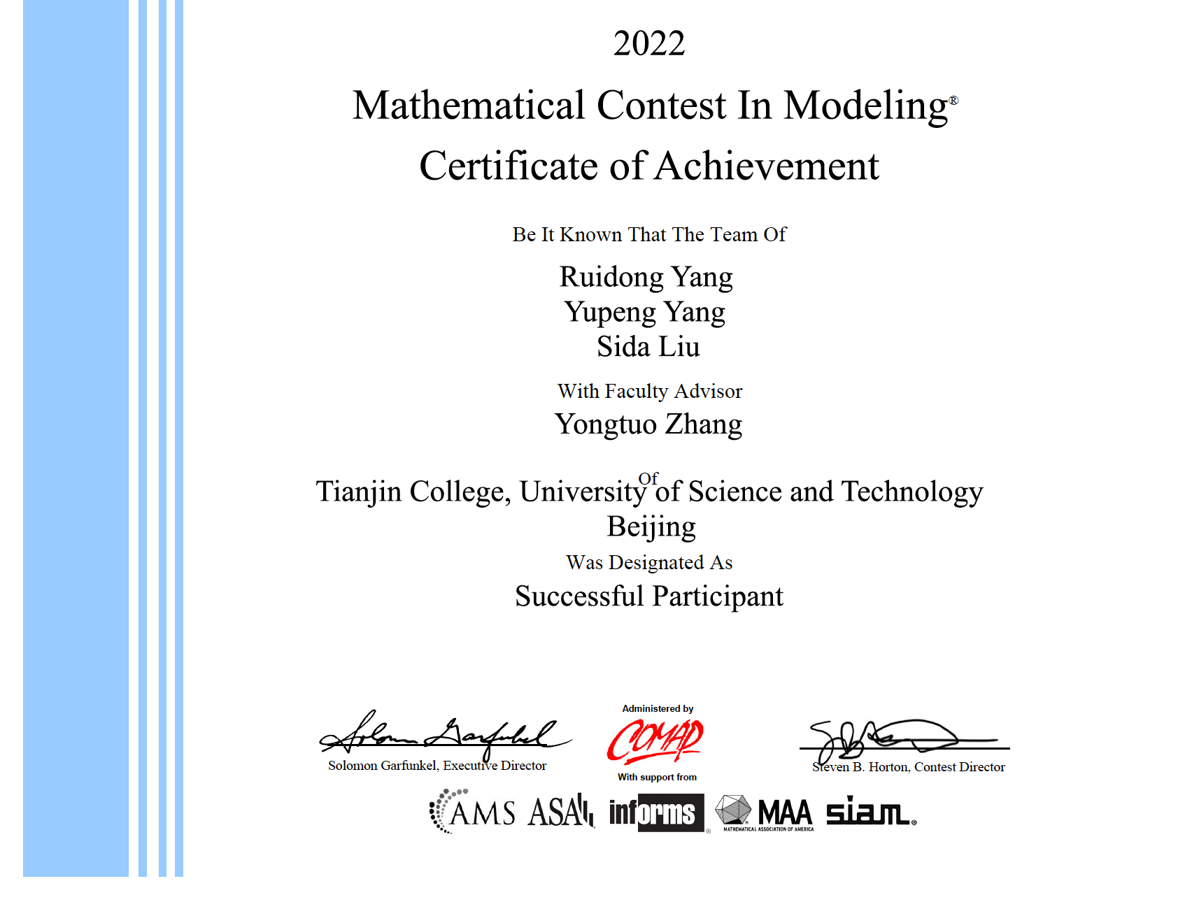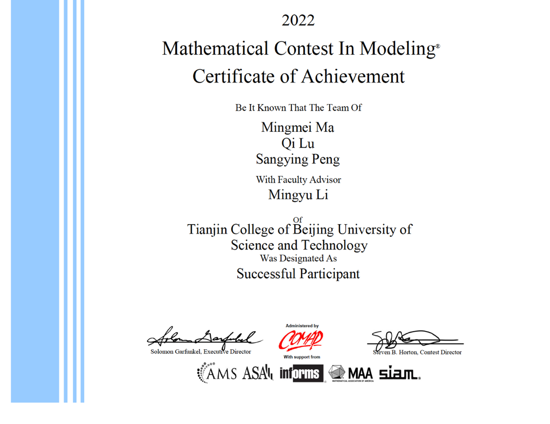 美国大学生数学建模竞赛由美国数学及其应用联合会主办,是现今各类数学建模竞赛的鼻祖,也是世界范围内最具影响力的数学建模竞赛之一。我院师生首战告捷,积累了经验,体现了我院学生优良的建立数学模型和运用计算机技术解决实际问题的综合能力,以及不断创新、团结合作的精神,也是我院教师“以赛促学、以赛促教、以赛促创”的教学成果,彰显了我院人才培养质量的提升。