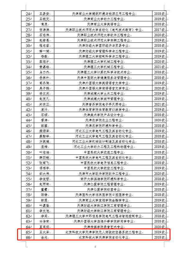近日,根据市奖学金评审委员会评审,最终确定了2021年天津市大学生创新创业奖学金获奖学生名单。我院2019级无人机系王大泽,2018级智能制造学院金光获创新优秀奖;2019级无人机系蔡伟伟,2019级智能制造学院李国昕获创业优秀奖。