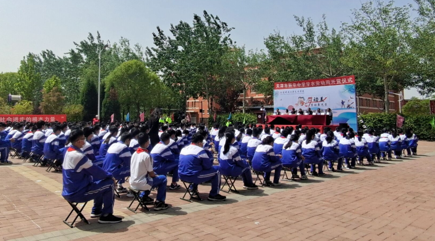 2021年5月6日上午,天津市新华中学学农劳动周活动在我院学生劳动实践基地正式开营,新华中学体卫艺主任苑晓林、七年级组长岳巍,我院党委书记丁煦生、副院长张永锋、教务长张建华、劳动学院院长王鹏文、艺术设计系主任兼劳动实践基地负责人孟庆田等出席了开营仪式,新华中学281名师生与学院部分师生参加了开营仪式。