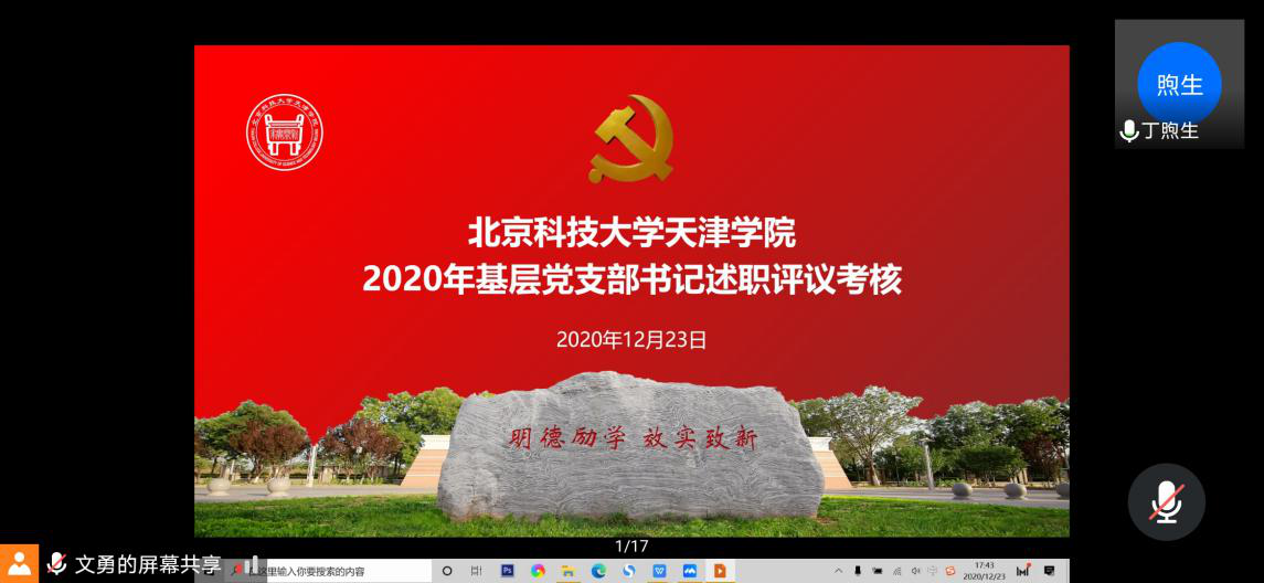 为进一步加强我院基层党支部建设,切实发挥党建工作的引领和保障作用,2020年12月23日下午,我院2020年度党支部书记述职评议会在腾讯会议召开。学院党委书记丁煦生,党委副书记叶振楠、牛犁,党委委员、党建办主任郭雅娟,各党总支书记、全体党支部书记参加了本次会议。