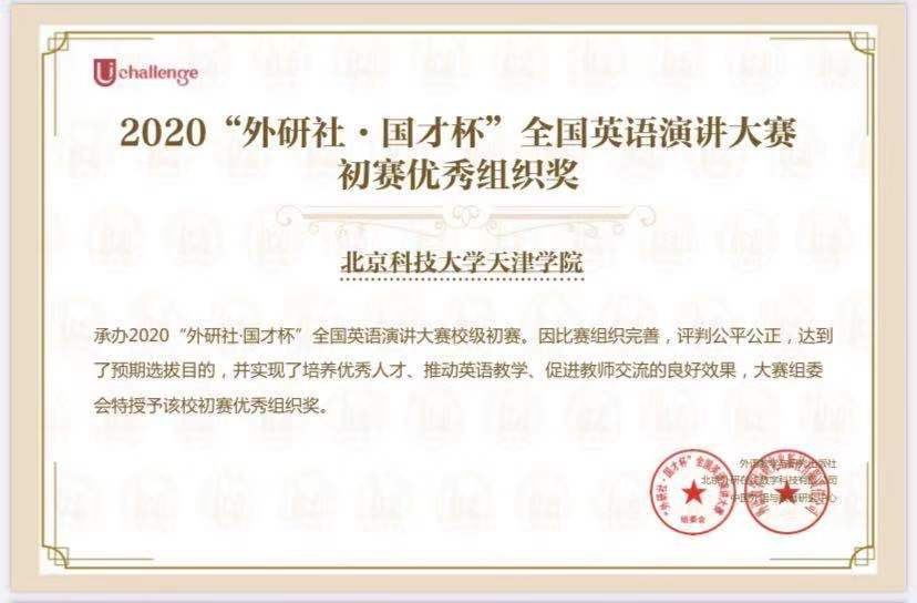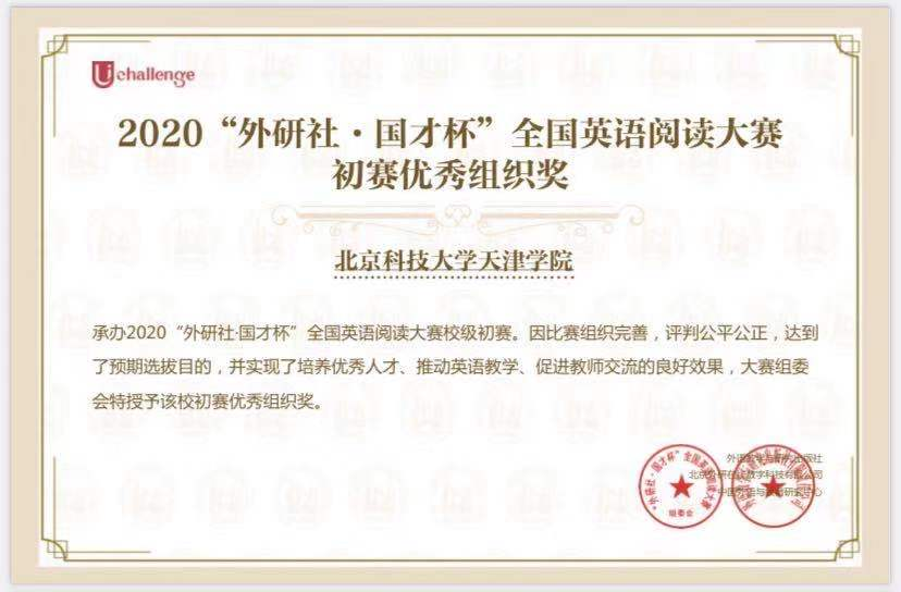2020年10月起,我院开展2020“外研社•国才杯”全国英语阅读、写作、演讲大赛组织工作,并成功承办校内初赛。被评为天津市第二十三届大学生英语演讲竞赛组织工作“先进单位”荣誉称号和阅读、写作、演讲三项大赛初赛优秀组织奖;外国语学院分团委书记李萌获得2020“外研社·国才杯”全国英语阅读、写作、演讲三项比赛的“优秀管理员奖”;教师张晓宇、张佳康荣获天津市省级复赛“指导优秀奖”;学生万海利、古锡蓉、董美含分别荣获全国英语阅读、写作、演讲省级复赛(天津赛区)优秀奖。