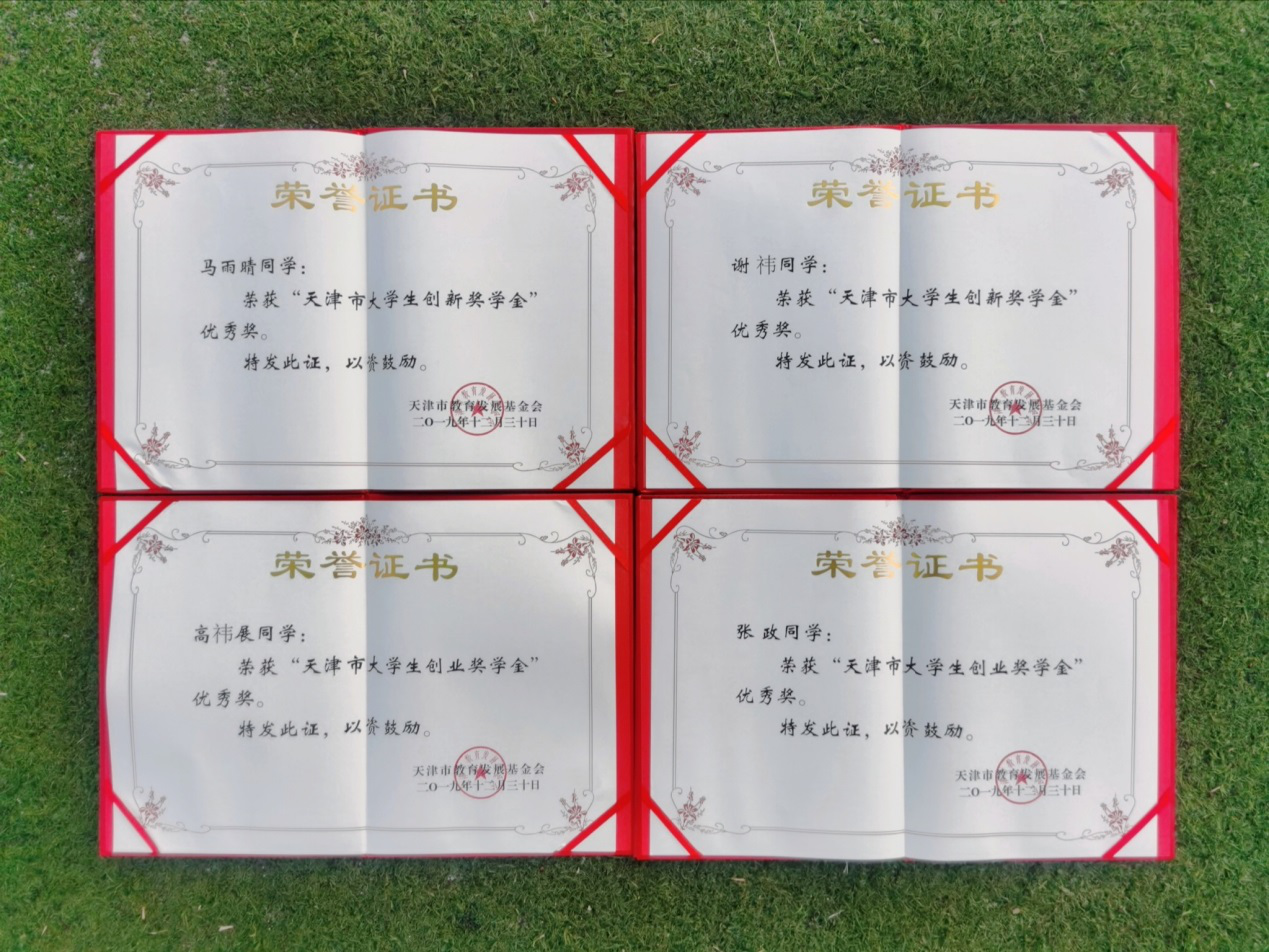 近日,市教委、市教育发展基金会公布了2019年天津市大学生创新创业奖学金学生名单,我院4名学生获得创新创业奖学金,其中2人获创新优秀奖,2人获创业优秀奖。