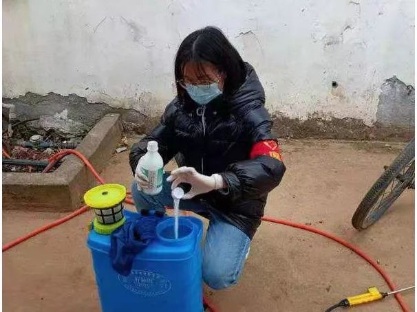 法学1803班李艳芳同学,在四川省绵阳市梓潼县文兴镇,自愿加入志愿者队伍,对社区喷洒消毒液,并且为社区老人普及防疫知识,积极为防疫工作做出力所能及的贡献。