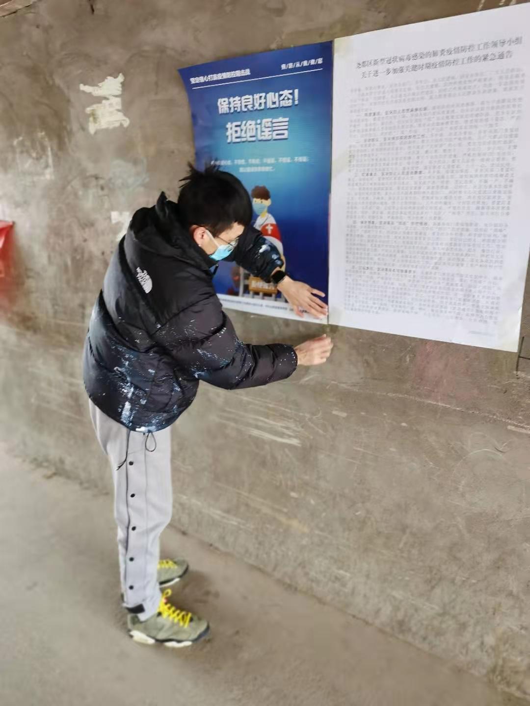 道桥1701班马小东同学,在新疆乌鲁木齐市米东区芦草沟社区,担任张贴疫情防控最新通告、提示标语,登记外来人员信息、讲解疫情防护知识工作。