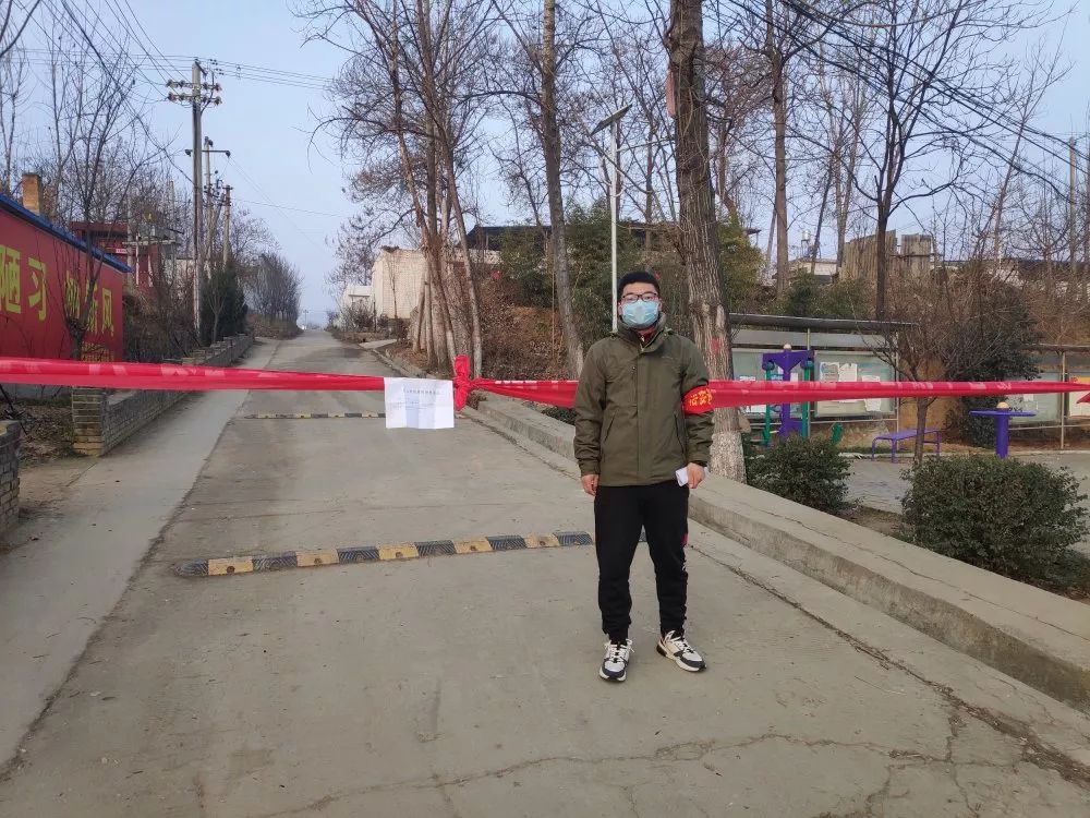 通信工程1702班刘浩同学,在陕西渭南市华州区高塘镇圣山村,担任村民进出登记,发放防疫资料,劝散聚集群众,叮嘱村民正确佩戴口罩等工作。