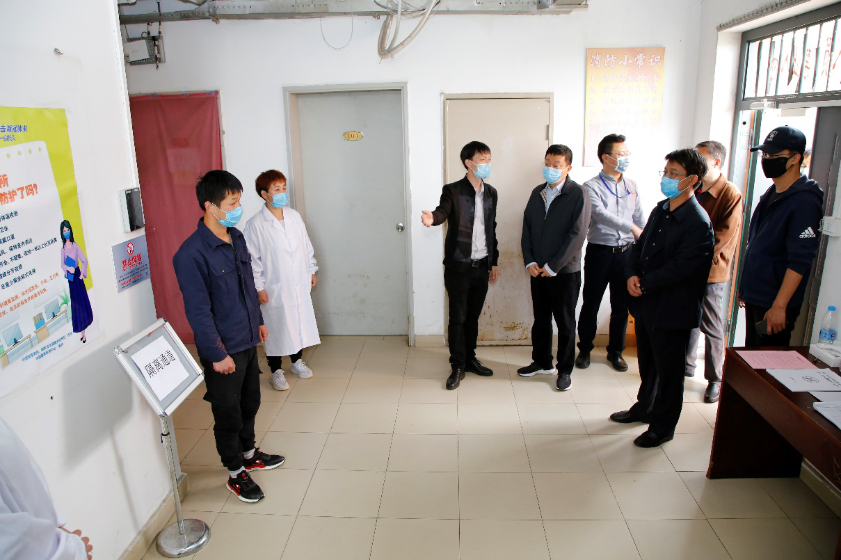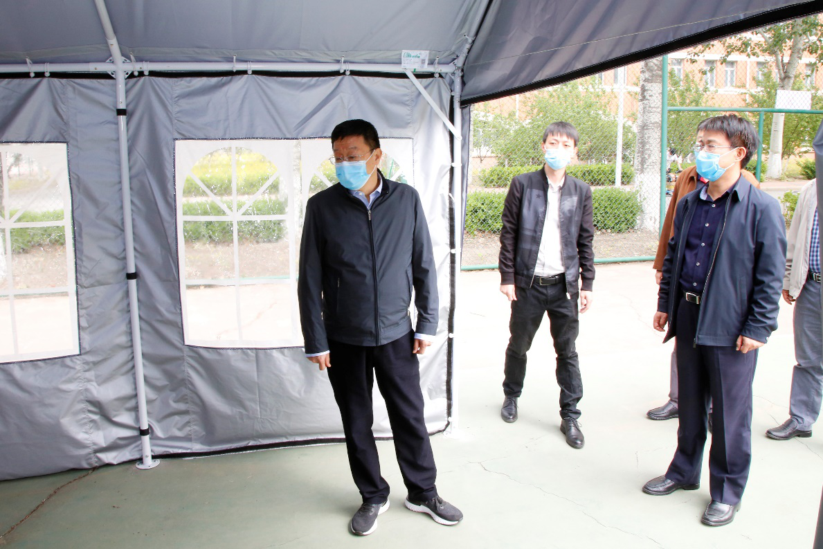 何校长听取了王斌院长关于复课开学准备情况汇报。王斌院长详细了介绍学院在制度建设、返校情况、疫情防护、人员配置、物资准备、校园安全等方面所做工作。何校长一行还现场观看了学生入校、学生宿舍应急处置以及送餐分餐模拟演练,并重点考察了防控物质储备和临时隔离观察点建设情况。