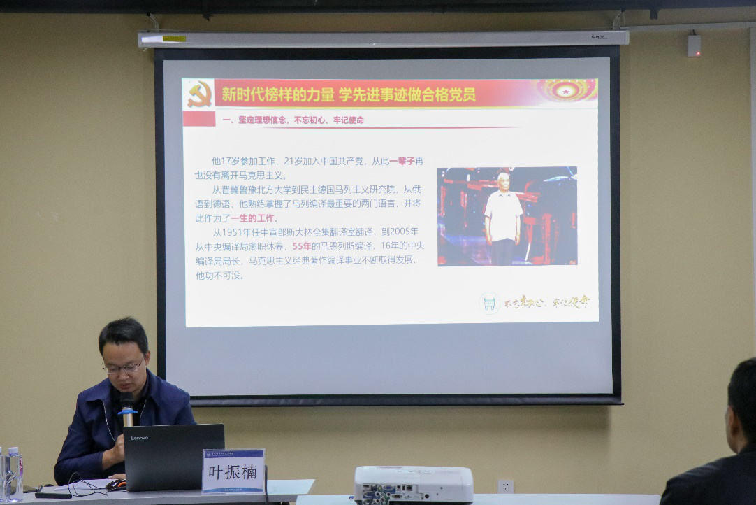 为深入学习贯彻习近平新时代中国特色社会主义思想和习近平总书记关于学习先进典型事例的重要指示精神,扎实推动“不忘初心、牢记使命”主题教育深入开展。10月28日下午16:00在众创空间路演室,我院党委副书记叶振楠讲授了“新时代榜样的力量,学先进事迹做合格党员”专题党课,各院系党总支书记、辅导员、保卫处、教师工作部等相关部门人员参加。