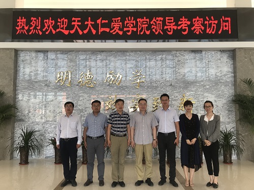 5月28日,天津大学仁爱学院党委书记谭欣、两办副主任王悦、计算机系党总支书记蔡志利莅临我院考察交流。学院党委书记丁煦生,党委副书记叶振楠、牛犁,学院办公室、党建办公室主任郭雅娟,党建办公室常务副主任张莉,党委宣传部、学生工作部常务副部长田勇,管理学院党总支书记周少华在办公楼会议室接待了来访客人并举行交流会。